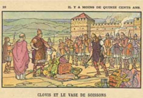 À la fin du XIXe siècle, les manuels scolaires ont commencé à utiliser des illustrations pour enseigner l'histoire, rendue obligatoire en 1890. Des réformateurs comme Victor Duruy, Jules Ferry et Ernest Lavisse voulaient inculquer aux enfants l'amour de la Patrie et de la République. Clovis, un roi important de cette époque, était souvent présenté dans ces livres. Parmi les scènes les plus populaires, on retrouvait son baptême, des batailles et l'histoire du Vase de Soissons, qui montrait sa puissance ou la brutalité de son temps, selon les versions.