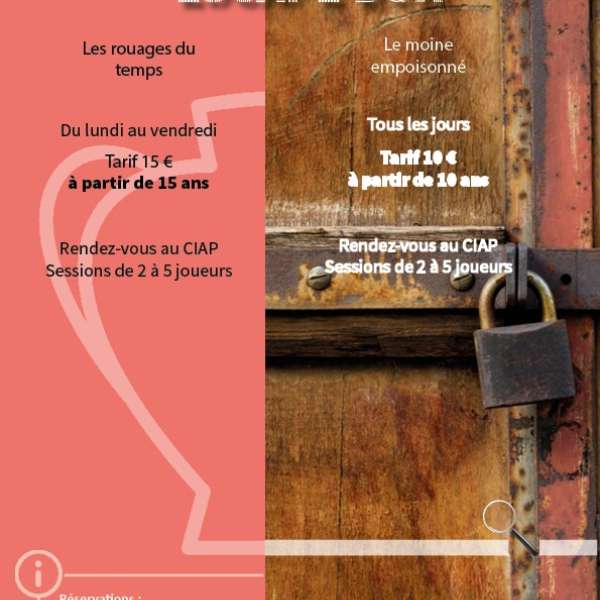 Le moine empoisonné pour les + de 10 ans (10 € /personne) ainsi que les Rouages du Temps pour les + de 15 ans à (15 €/ personne).