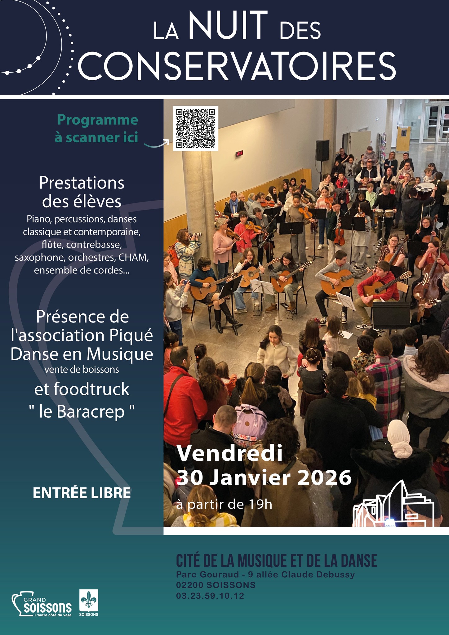 Le vendredi 30 janvier 2026, à partir de 19h, la Cité de la Musique et de la Danse de Soissons invite le public à vivre une nouvelle édition de la Nuit des Conservatoires, un rendez-vous national dédié à la découverte et au partage des pratiques artistiques.